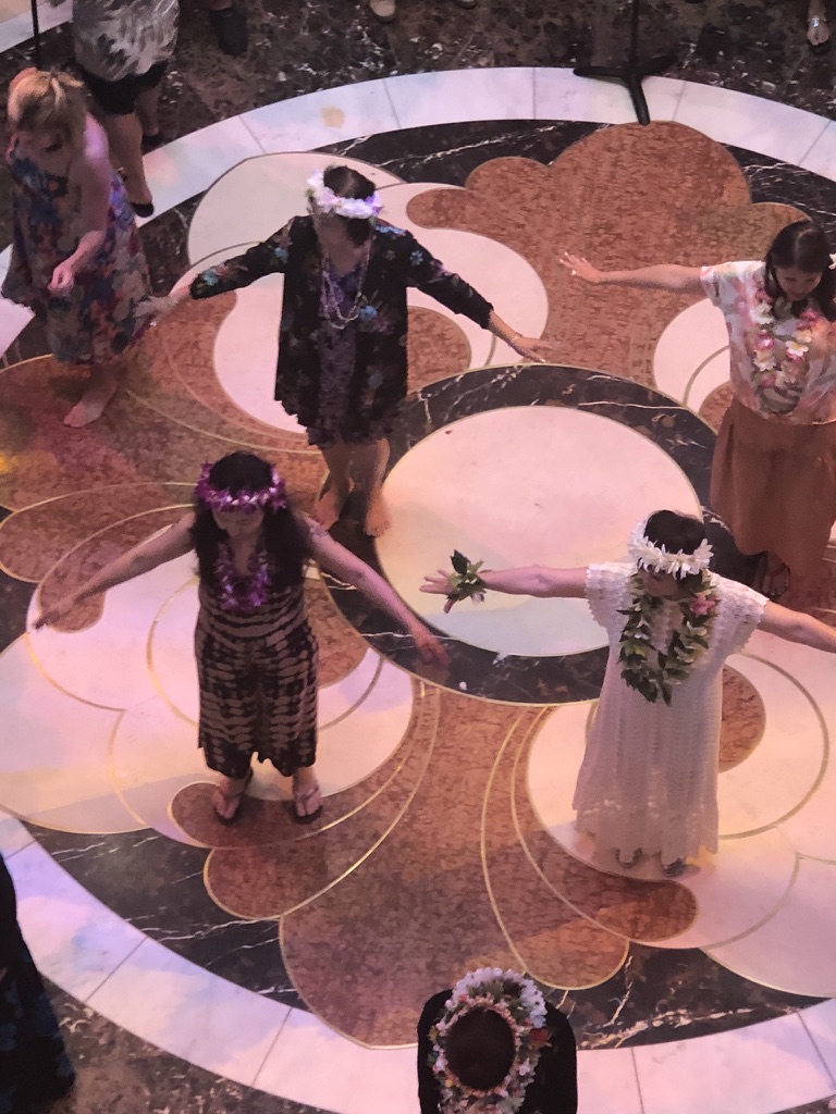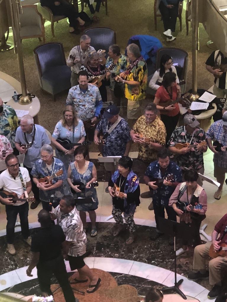 Yesterday the passenger that had been practicing ukulele and Hula dancing on our sea days gave a performance. I had watched a bit of the hula dancing at the beginning and definitely saw a LOT of progress during the cruise. They were charming performances.
