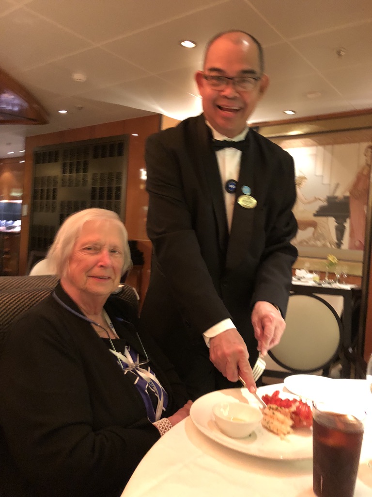 Saturday night was our last formal night and they served lobster, one of Carol’s favorites. Carol did not want the rice and wilted spinach that was served with it and was thrilled when the waiter offered her a second lobster tail instead.