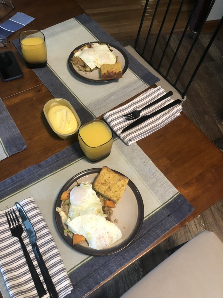This was a pretty inspired brunch on Sunday – vegetable has with eggs over easy and homemade cornbread from masa. Fortunately, he is easy to impress and please with food.