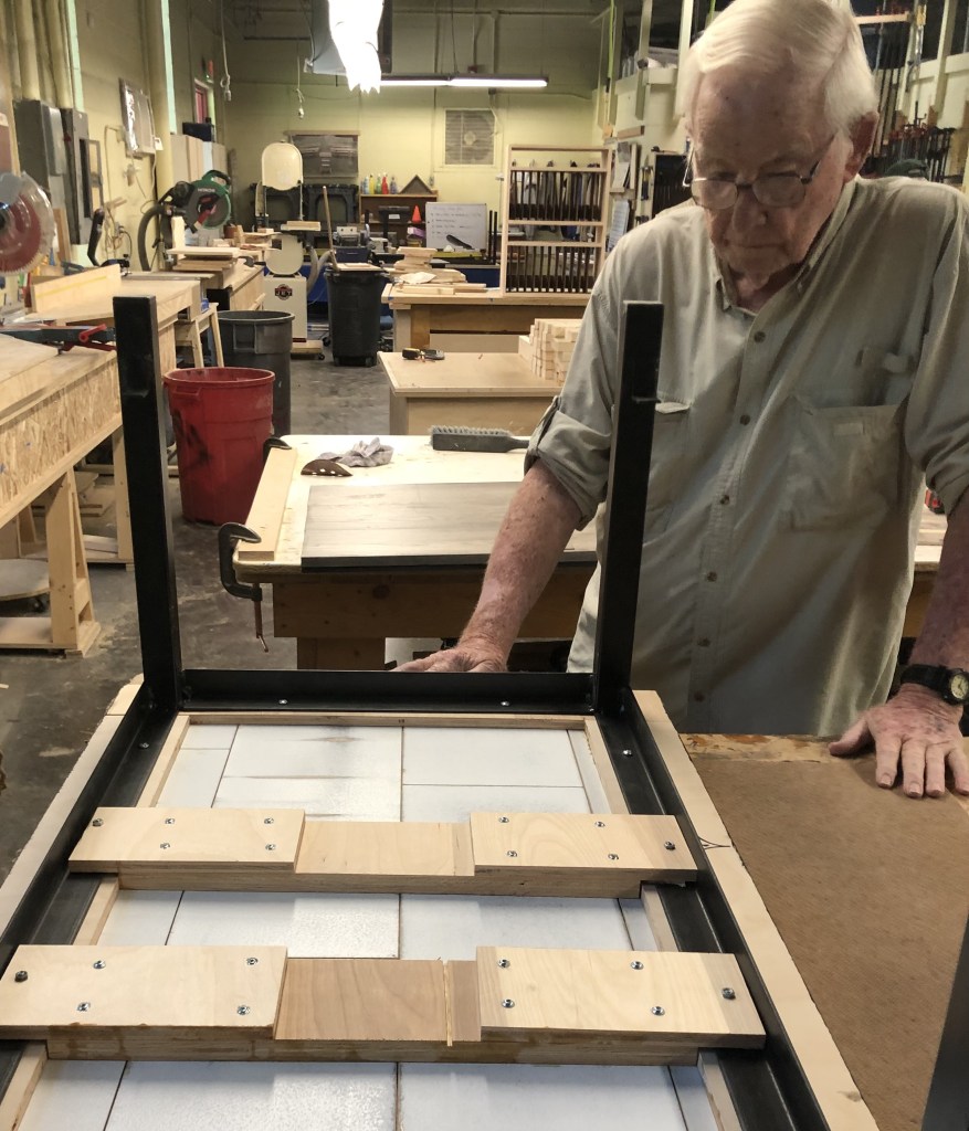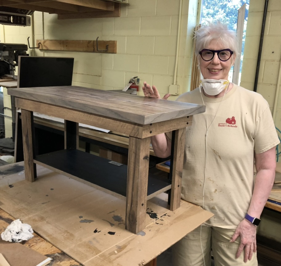 I started volunteering at Nashville Tools for Schools in December 2021. For the first 6 months I worked on the bigger school projects and then I was asked to start working with Harry in the “Fine Furniture Department”. Harry was 91y/o at the time and a legend in volunteer carpentry. He helped start the Supervisor on Site role at Habitat and got involved in NTFS early on. Harry lives in a western suburb of Nashville so his commute to the workshop can be 30-60 minute. Mine is 10 min on a bad traffic day. The Fine Furniture Department uses leftover wood from the school projects and donated material to make tables for organizations that are helping people transition from unhoused to housed such as House2Home Nashville.