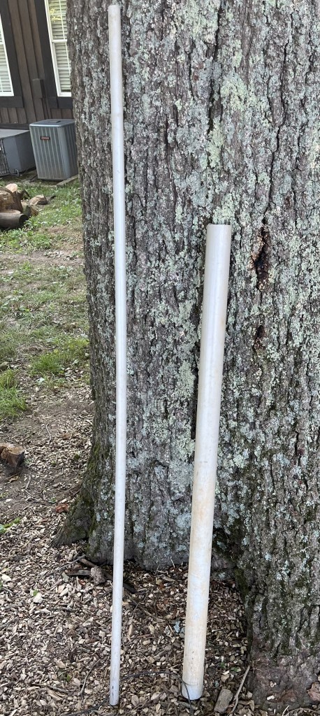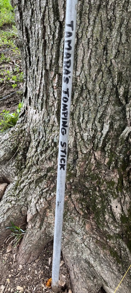 We started out the terrace project with 2 tomping sticks. One small diameter and one larger. The smaller one had a bit of weight in the bottom but not much. The larger one had more weight which was great for tomping in holes that it could fit which was not that many. On June 17th, we were at a point in the project where we both needed the small tomping stick. Craig disappeared to the shop and came back 20 minutes later with what he called the ‘perfect” tomping stick. It was metal and had more weight in the bottom than the PVC one. This meant it could facilitate packing just by dropping it. I didn’t have to grip it so tightly to pound it down. Craig personalized. the stick