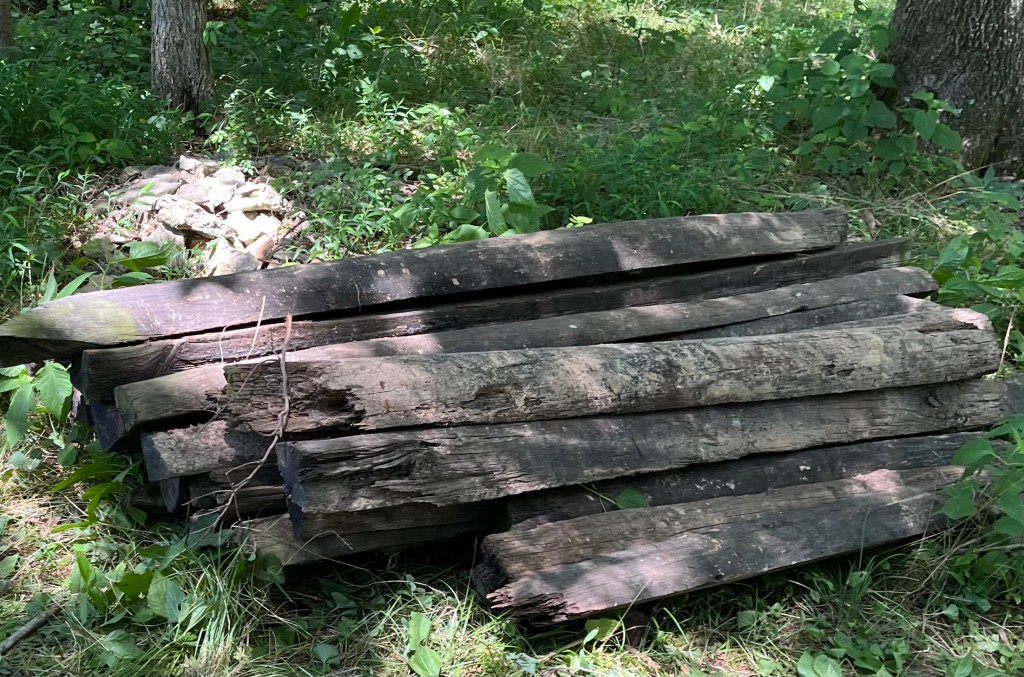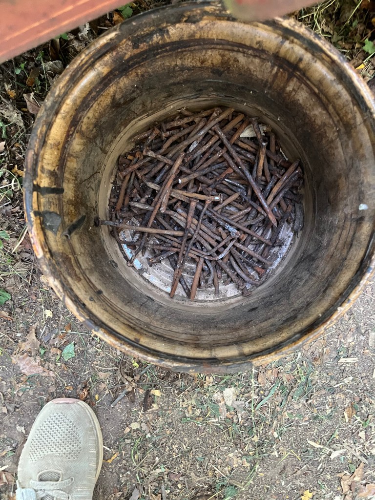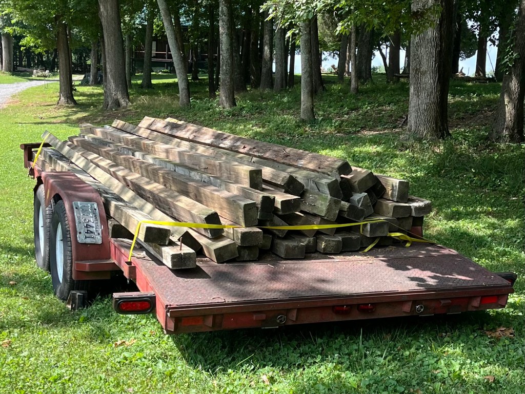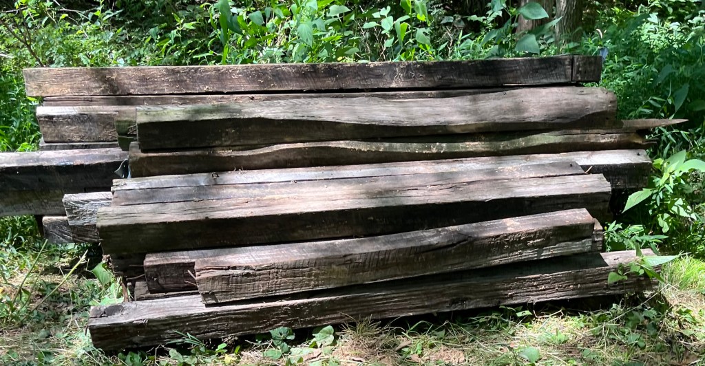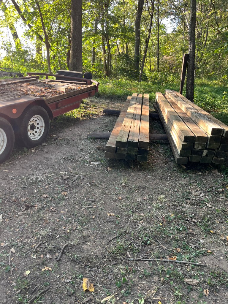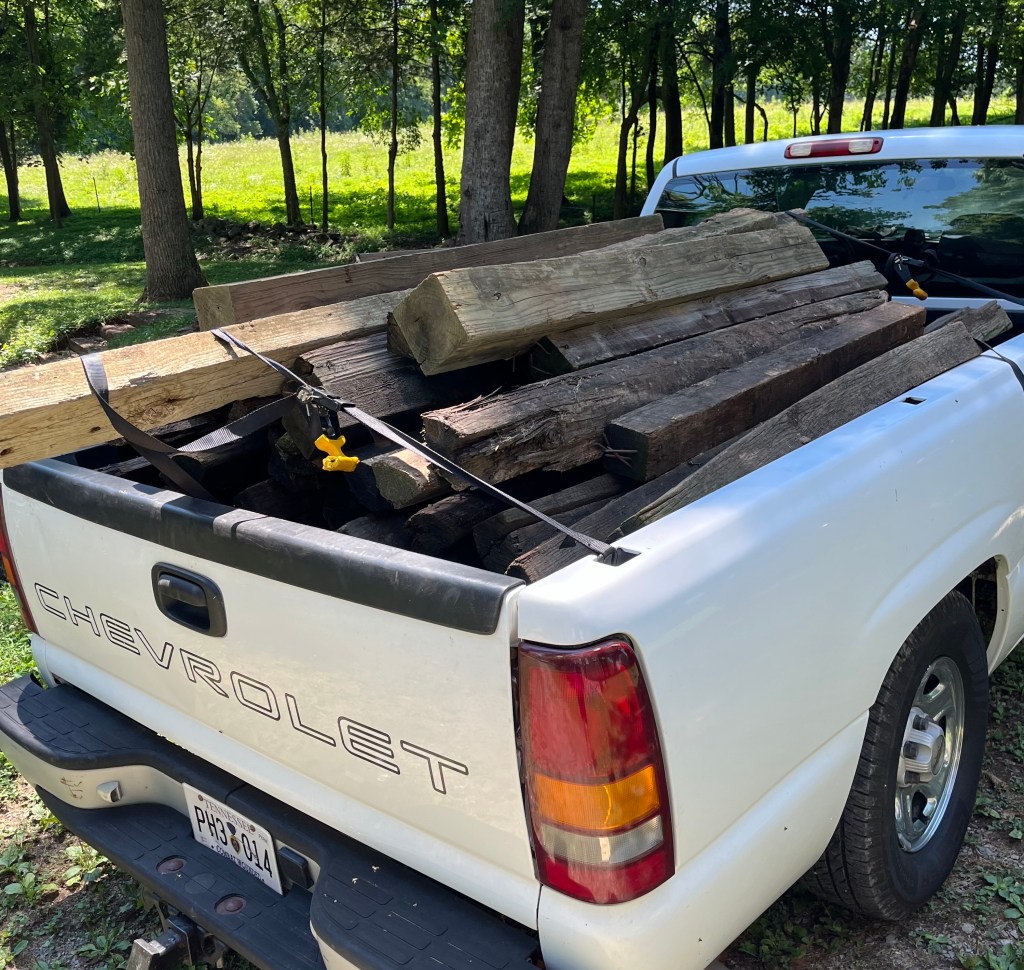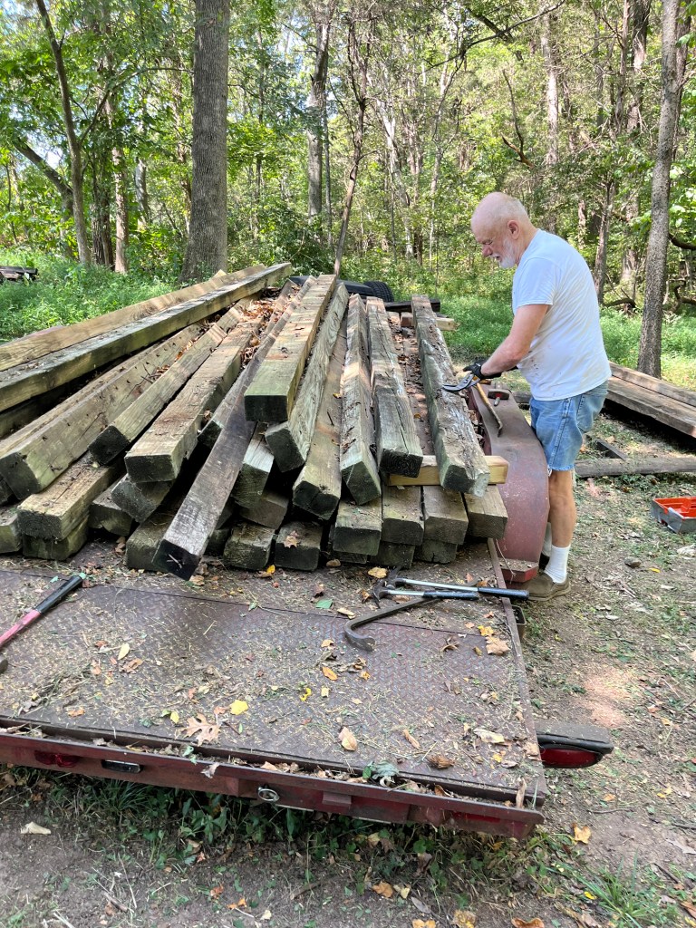 I was so excited to get my work clothes on and help unload all of the old bridge wood from the trailer. Some of the word will be used for structural needs (hot tub enclosure) and much will be used for landscaping soil erosion prevention. Either way, we do not want nails sticking out of the pieces of wood so before we unloaded each piece, it was inspected for nails and most nails were removed. If they couldn’t be removed, they were pounded in so we shouldn’t injure ourselves.