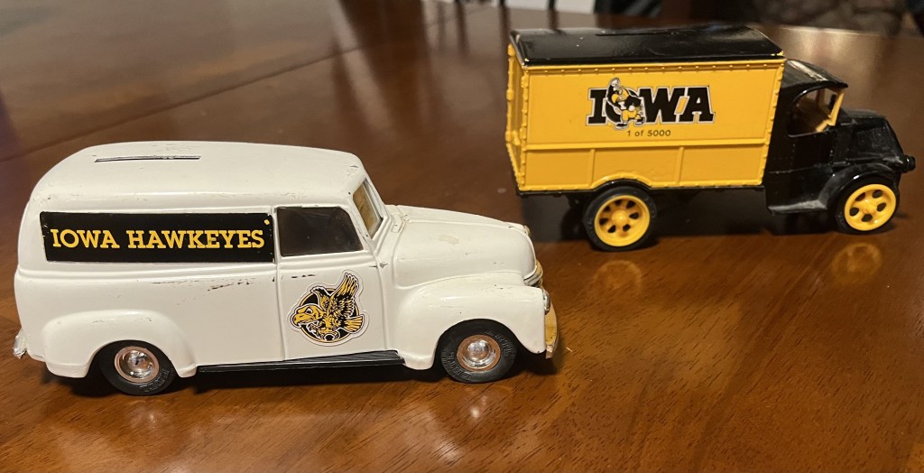 We moved some furniture from the condo to The Garden and prepared both places for my brother and sister-in-laws visit. It was a GREAT opportunity to get a lot of stuff done that was on the To Do list but never quite got to the top. As a part of the 3rd floor organizing process, Craig found these two models from his old collection. He had no previous connection to Iowa and does not recall where they came from. The black and gold one is now it Iowa and we have kept the white one that is similar to his old panel truck we have in the shop. How random.