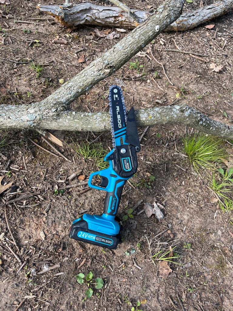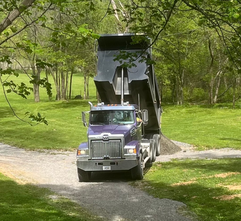 Craig takes good care of me. Last week Craig observed some unsafe chainsaw technique on branches that were too big for the loppers and a bit flimsy for the chainsaw. So I found myself the proud owner of a 6 inch mini chainsaw and after watching a couple of videos on safe use of chainsaws I had a pair of what I now call my “chain chaps”. A couple of days ago we had a load of gravel delivered for our driveway maintenance, Craig called me to see the real life purple dump truck.