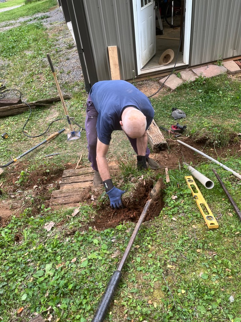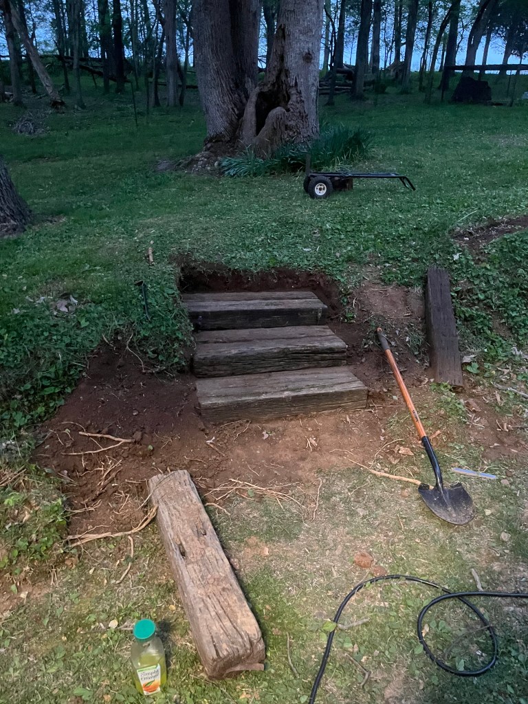This week our big project is building a set of steps out of railroad ties into the slope leading from the south end of the shop where I park my car and have my work bench. Craig did not want me to have to walk around the slope. Actually, he had been planning on putting the steps in for the past 5 years so they not just for me. As we continue with his list of projects that have accumulated over the past 5-7 years, I get to stay active and learn a lot. Craig said if he had a blog, he would have to title it “Getting shit done with Tamara”.