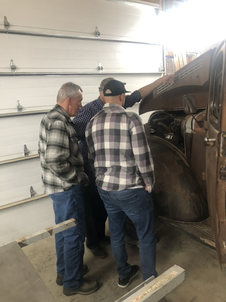 We picked Oly and Erick up at the airport at midnight and drove back to The Garden. After snacks, the shop was inspected. Here they are looking under the hood of the 46 Chevy panel truck.