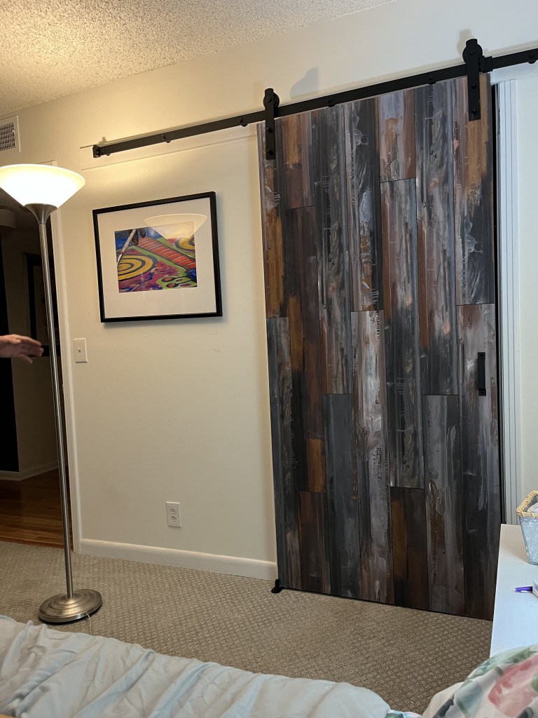 I started constructing a barn door style sliding door for the master bedroom at the condo in December. Craig did the installation yesterday. I absolutely love the look. So much better than the big white door opening into the room and hiding a corner.