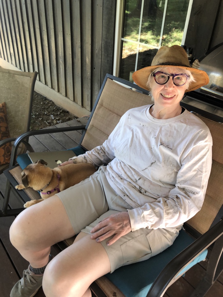 I am dressed for a day of yard work. This time I learned to use the weed whacker and I am pretty damn good with the lawnmower now. Picking up the sticks that have blown down off the trees is not my favorite part but it is good exercise.