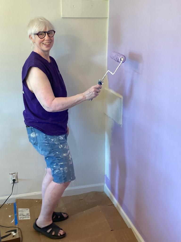 I did the rolling and Craig did the trim edges. As we were covering brown, we had to paint it white before painting it Wisteria. We got 3 walls done before I left for my NC beach vacation. Craig finished the 4th wall while I was gone.