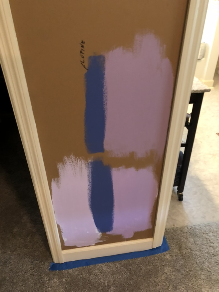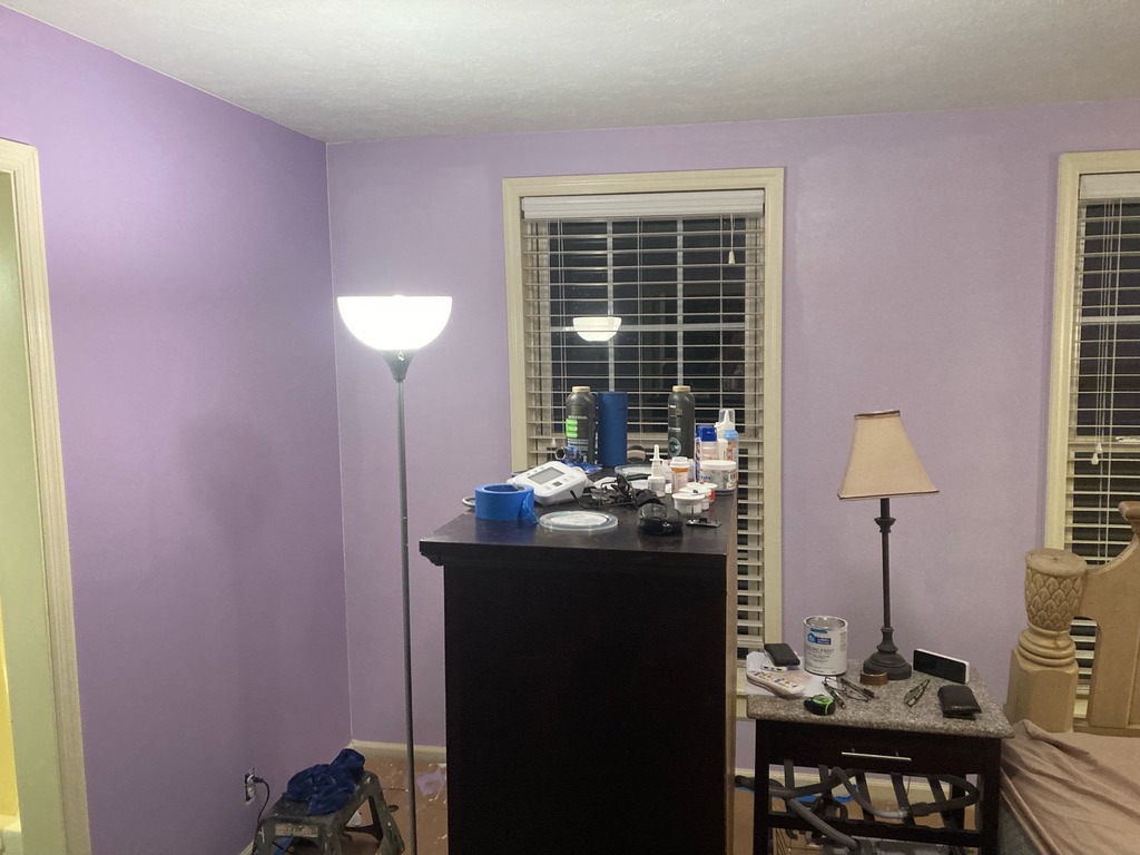 I previously mentioned that the dog patio was Craig and my second project together. Painting his master bedroom was the first. On my second or third visit, he mentioned that he wanted to repaint his bedroom and he wanted it to be romantic and cheerful. So I go to Google and search for romantic colors and essentially come up with red and pink. Neither were acceptable to him. He didn’t want yellow, blue, green or orange so we were pretty much left with purple. Now that happens to me my favorite color. We went to Lowe’s and picked up 3 color samples and painted on the wall.