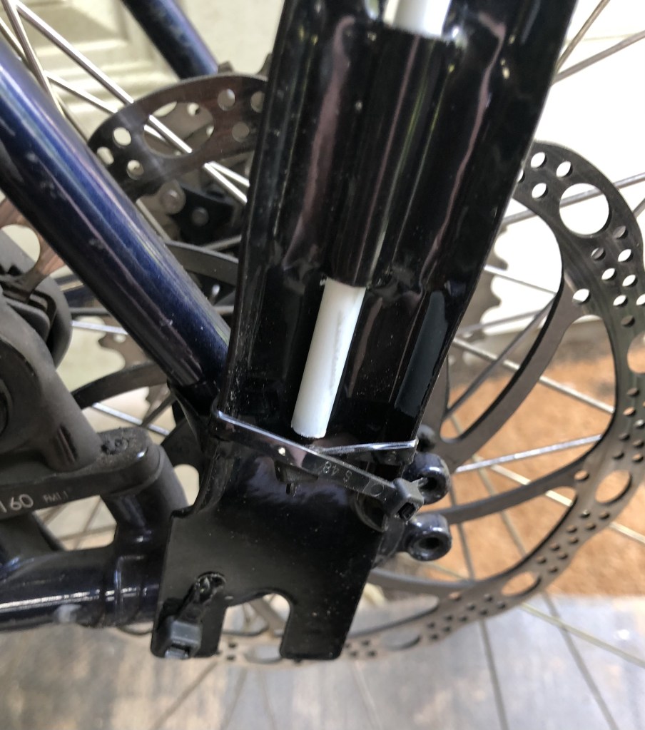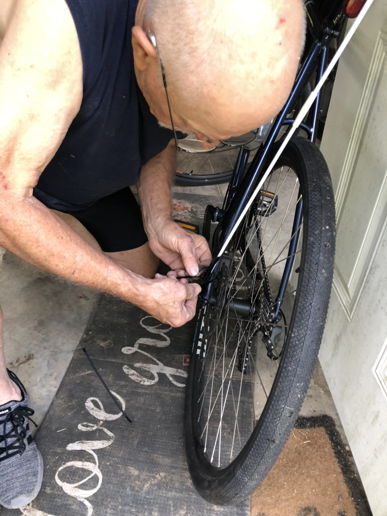 Craig had to figure out how to mount the safety flags on the bike as the mounting device did not fit where it was intended. 3 zip ties did the trick. It is more challenging for me to get on and off the bike with the flag but I will get used to it.