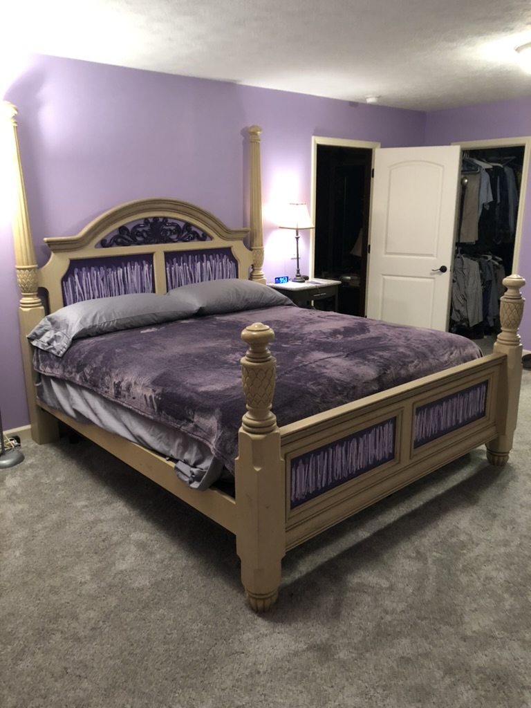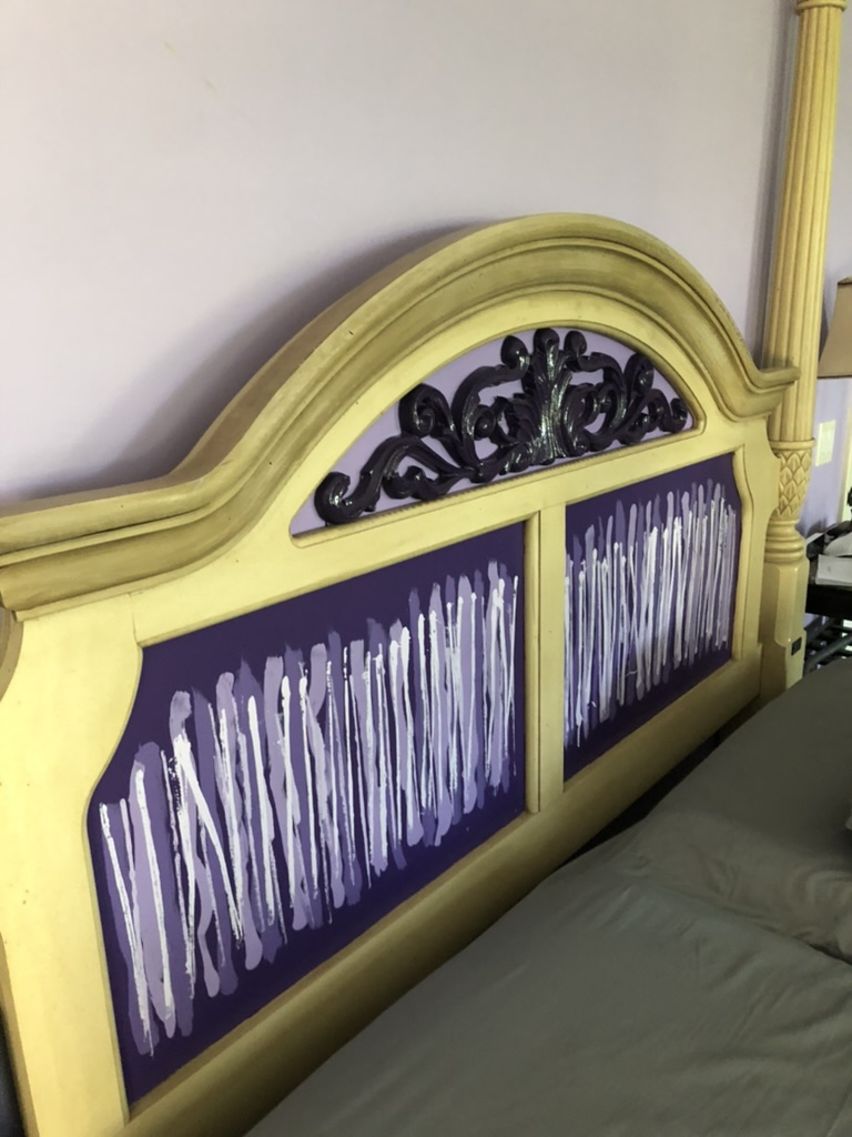 Natalie was dog siting Carli while I was gone and she texted me and asked me why Carli had white paint on her tail. I sent her a picture of the bedroom walls. Her response was “He is all in!!” He is and so am I. I had to go to Iowa for my brother’s funeral as soon as I got back from NC, so I didn’t see the bedroom for 10 days. While I was in Iowa, Craig said he was working on a surprise. When I got there, I found he had painted the bed headboard and footboard to go with the walls.