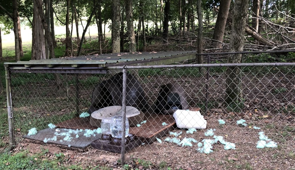 Both beds had been removed from the doghouses and Carli’s was missing much of its stuffing. We had thought that a small house for Carli would give her a place to be if she needed to get away from Buckley. It never occurred to us that she would take Buckley’s for her own. You can’t really blame Buckley. Now I really wish we could see what really went down. I found more humor in the situation than Craig did.