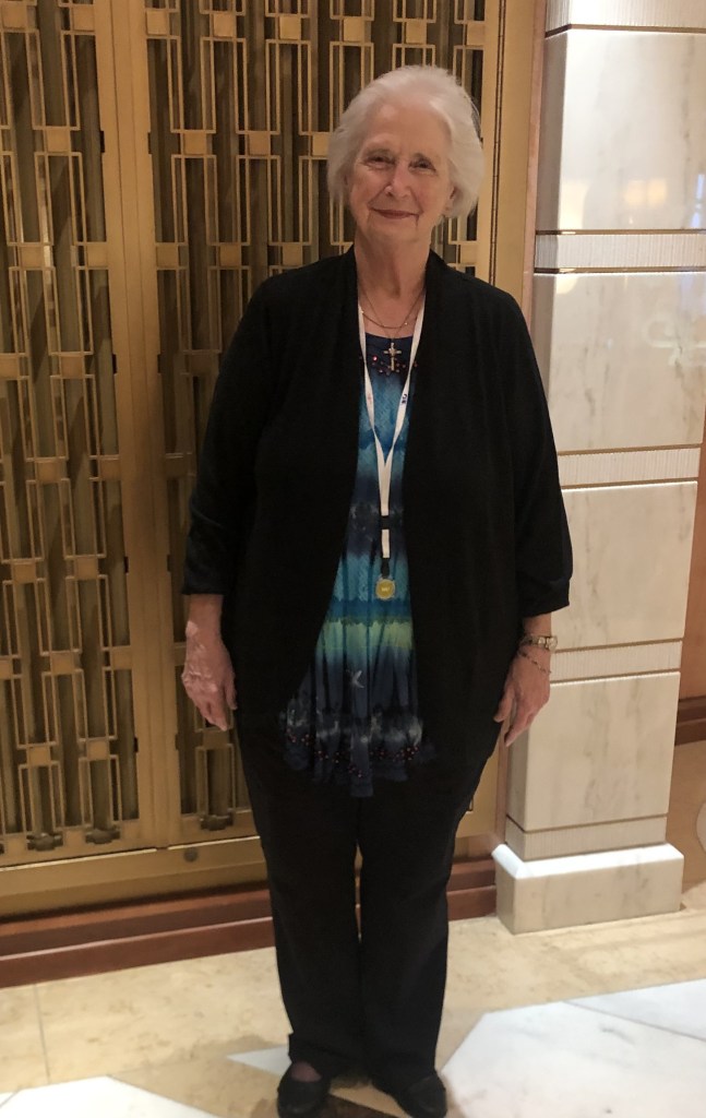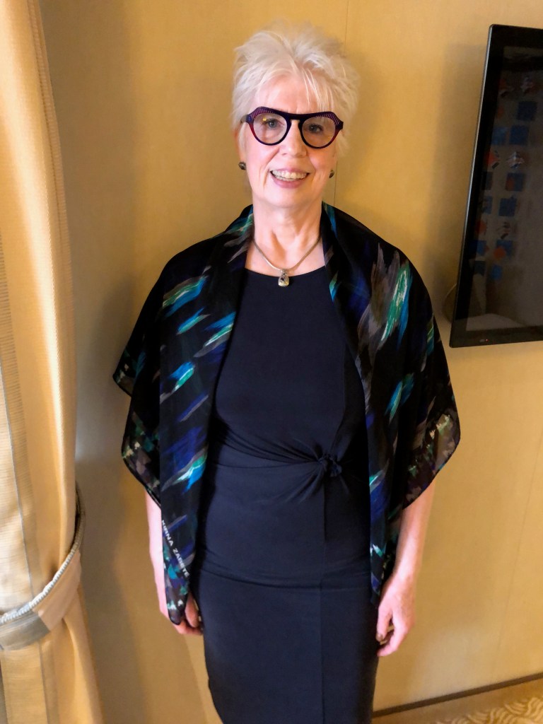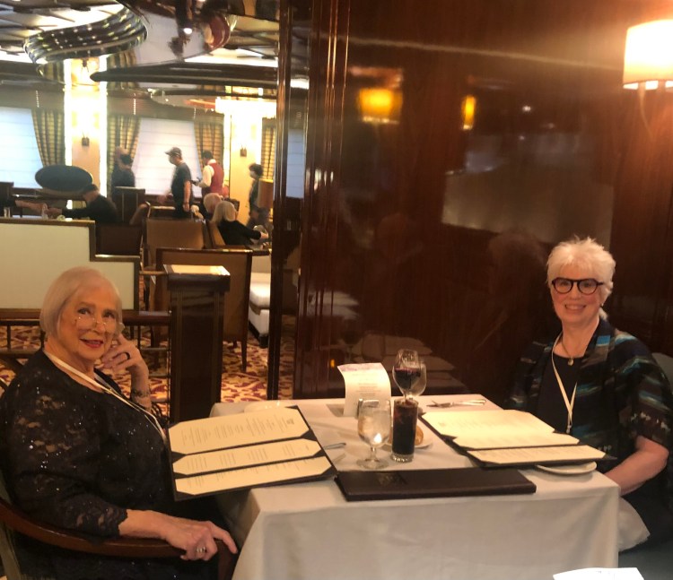 Last night I went through and made us reservations in the sit down dining rooms for all of our nights on the ship. Some nights we got a private table and some nights we will share a table. Tonight was scheduled as a private table. I practiced putting a bit of make-up on Carol tonight – mascara, eye-brow pencil and lip stick to get ready for Thursday. It was pretty minimal but it seemed like a lot to her. She told me that she spent one year putting Mary Kay makeup on every day. It took her about 30 minutes and after the year, she decided it didn’t make her look better so she stopped. I thought the little bit I did made a nice difference. My self-esteem about my appearance was damaged by my older brother and she said her older sister Betty did the damage to her confidence in her appearance. She did not want to wear the sweater with this top because the top was longer in front than the sweater. This is so not a big deal now but was a real no no when she grew up. It was too cool to go without the sweater so she wore it.