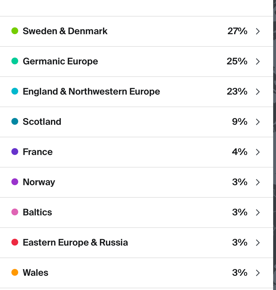 I got James and I ancestry kits for Christmas. My results became available yesterday. I was kind of hoping to find something surprising – at least a tiny bit of Mediterranean ancestry but alas it is nothing very exotic.