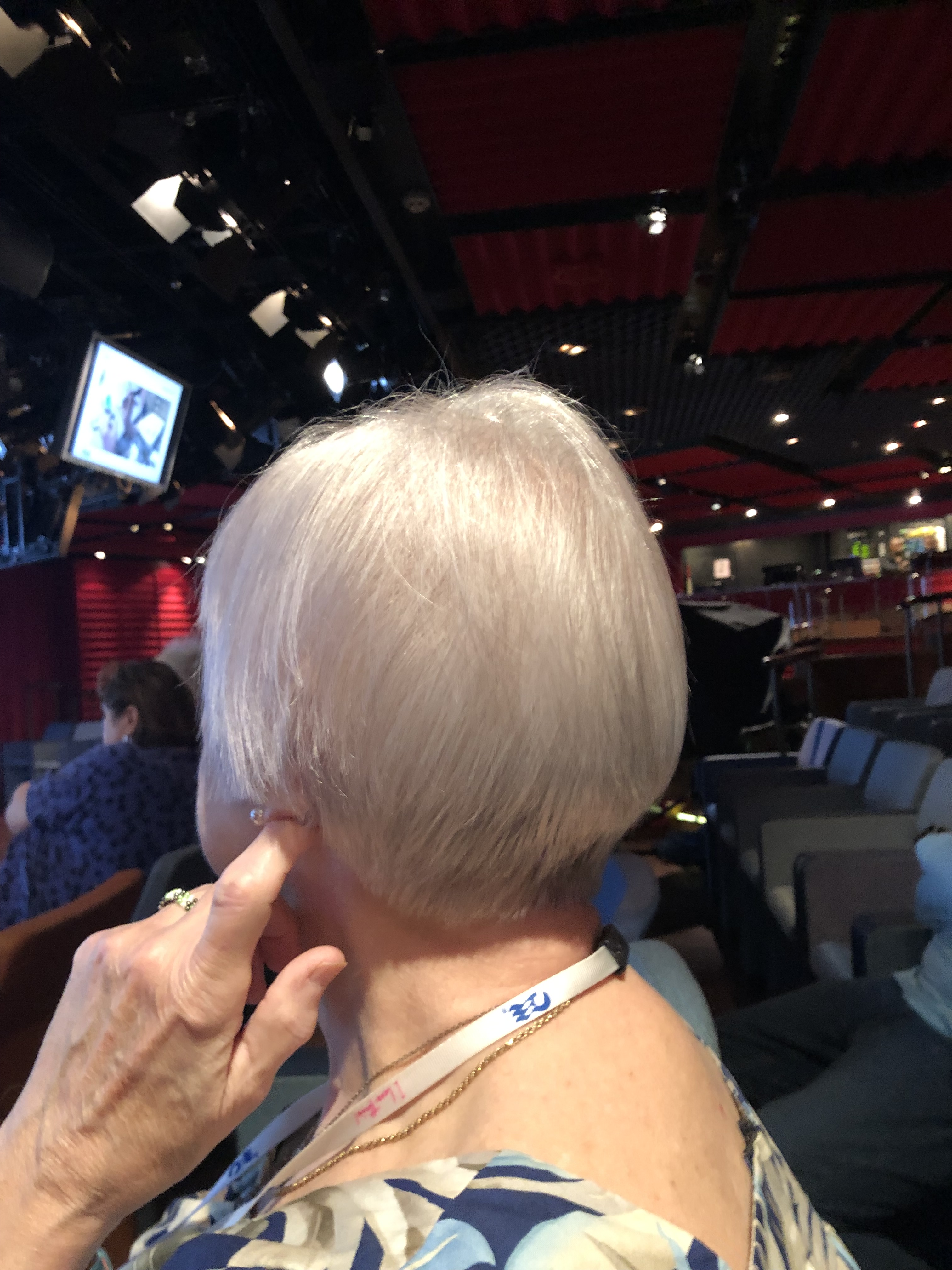 The reason that she does not want to wear her hair back is because she can see the the clear loop other hearing aide when she looks in the mirror. I cannot see it when I look at her face to face. But she knows it is there and it makes her feel old to see them.