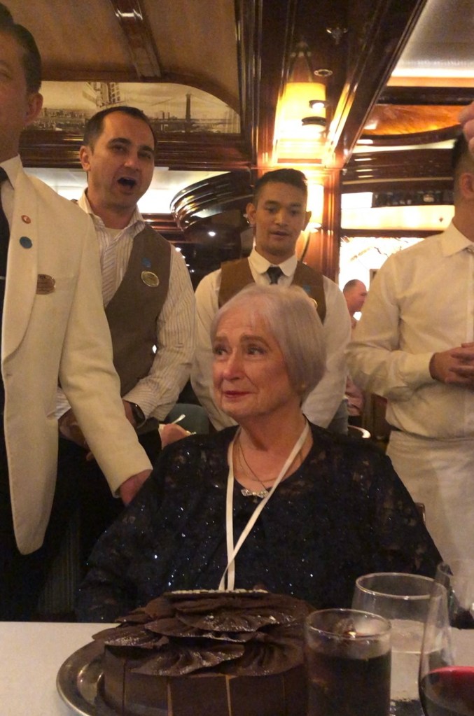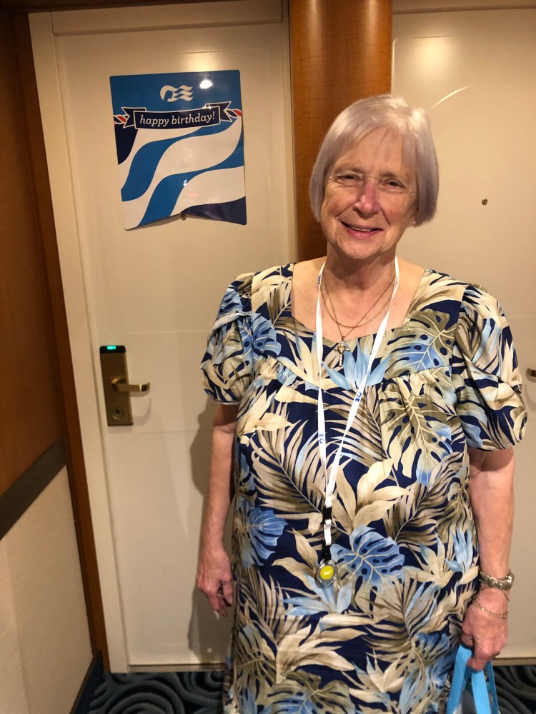While Carol was getting her shampoo, I went to Customer Service to make sure I could get her cake delivered to or table at dinner in the Crown Grill where we will have a lobster dinner. The officer who helped me was Rosa who what the one that had to deal with me on Monday during the documentation fiasco. She remembered me and was very nice. While she was making sure she had everything arranged, she asked if I had paid the upcharge for the specialty restaurant which I had. She then proceeded to arrange to have the amount refunded so the dinner would be on her. It was such an act of kindness that it brought me to tears. Rosa came around the desk and gave me a hug. I think I finally stopped holding my breath and accepted that this was going to be an wonderful birthday for Carol.