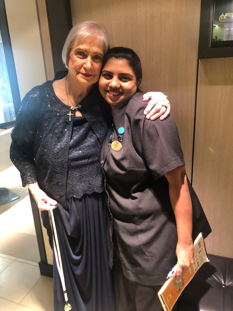 Meanwhile back in the salon, Vish asked what time our dinner was – 620 PM. It was early at the time I scheduled it but it turns out it is a good thing because Carol is ready for bed by 8. We are now 4 hours behind our normal time. Vish said if we could come back at 530 today she would do makeup for Carol so she could really be queen for a day. That almost brought me to tears as well as I was going to give it a go, but I suck at putting makeup on anyone else. I barely get it on my own face. We ran out of time to finish the hair style so she will finish that later as well. She was terribly sweet and made Carol feel very special.