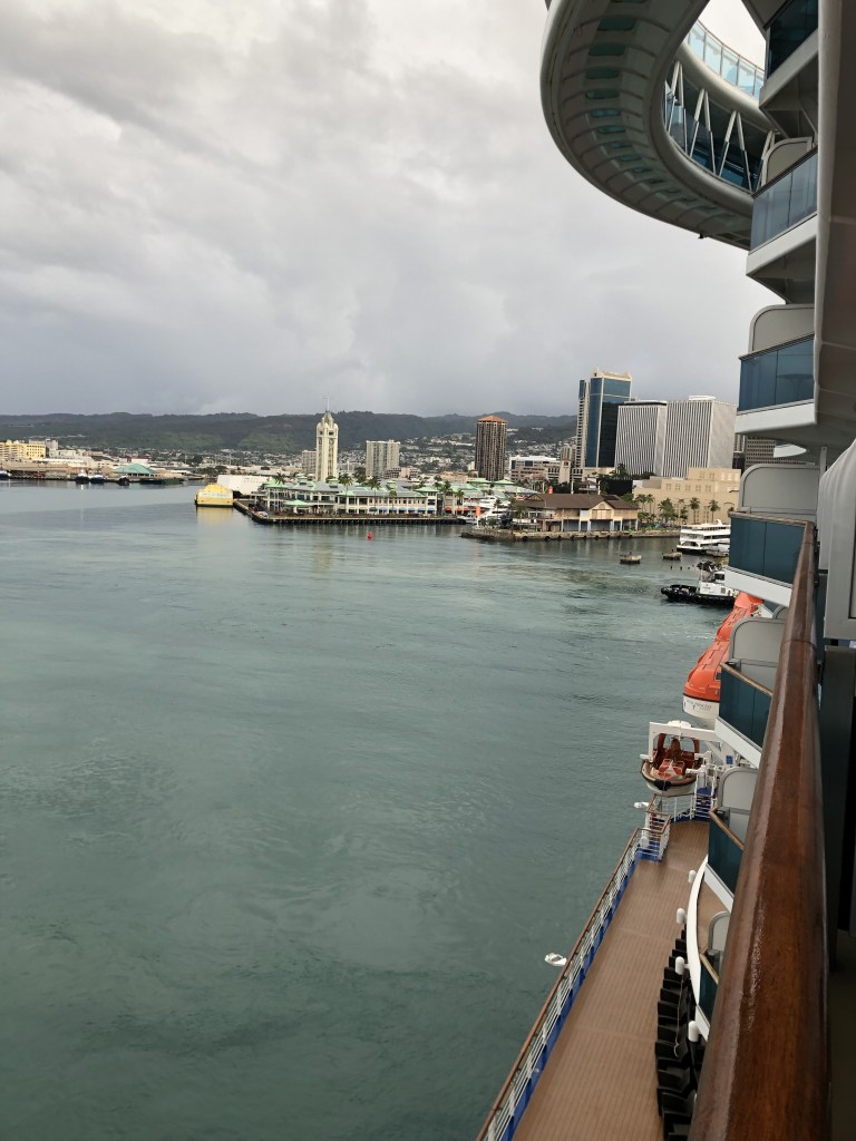 We have docked in Honolulu. My former colleague from NIDDK, Terry, who lives in Honolulu is going to pick us up and take us to her house so we can watch the Iowa play in the NCAA Women’s Basketball finals. I was able to reschedule the Pearl Harbor Tour for tomorrow instead. After the game we will do a driving tour of the island and then get dropped off at the Paradise Cove Luau at 5 PM. Terry has graciously offered to transport us back to ship after the Luau. We will meet up with her again tomorrow evening for dinner at one of her favorite restaurants. Go HAWKS!!