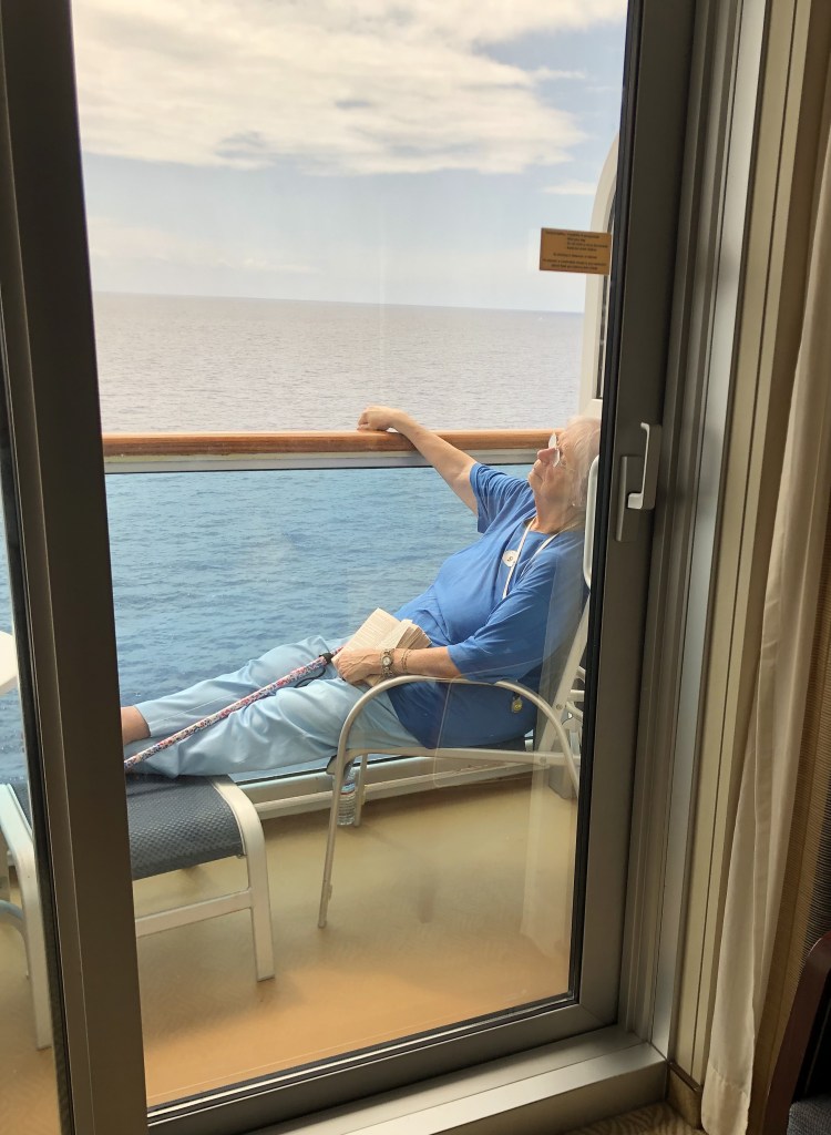 While I cannot get the picture to upload, Carol finally had a chance to sit on the balcony (with a warm jacket), watch the water, listen to the waves and read.