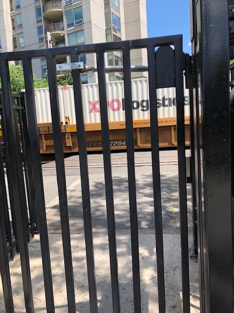 After negotiating the trail being occupied by many, many young people warming up for the regatta, I found myself on the streets of Manayunk for about a mile. The drivers seemed to be used to sharing the road with cyclists and I didn’t feel unsafe. After Manayunk streets came a canal towpath – much of which was not paved but was hard packed and easy riding. Along the towpath, I spotted a mother goose and her baby geese walking along. Another cyclist coming from he other direction had stopped to watch when a lawnmower came along and they all disappeared into the bush. Bad timing. They were very cute. The towpath was followed by paved trail with almost no pedestrians or cyclists that went on for miles and miles. I rode out a total of 16 miles and turned around. It was an uneventful ride back. When I got back to the access point for the trail in the City, I was confused because there was a closed gate that I didn’t notice earlier. Suddenly a very long train came by on the tracks on the other side of the gate. No one is going to accidentally get run over by a train here.