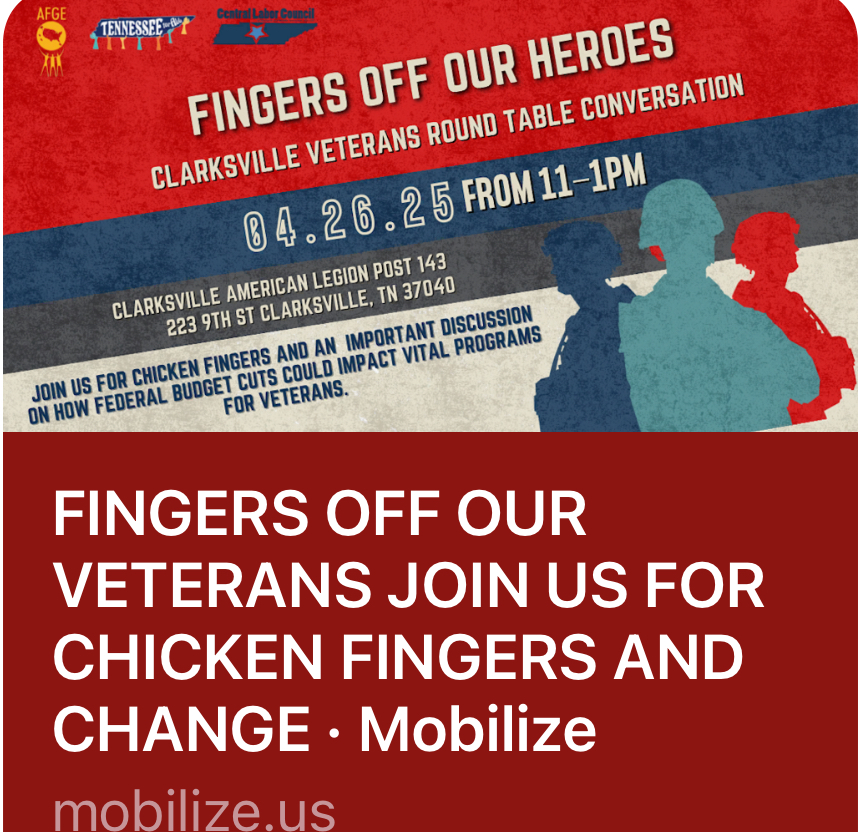 Clarksville is about an hour NW of us. Craig was stationed at Ft. Campbell right outside of Clarksville in the mid-70’s. There are many veterans in that community so we thought we would find a sizable group gathering for this event. When we arrived there were more organizers than veterans. It was hosted by Tennessee for All with participation of the AFGE (American Federation of Government Employees), IRVA (Iraq and Afghanistan Veterans of America) and a member of the Nashville Metro Council Veterans Caucus. The organizers seemed undaunted by the low participation and everyone went through their talking points. Then we got to the open discussion. There was a very vocal Afghan vet who had done 4 tours and was very connected to the local vet community. He was on disability because of lung damage from burn pits and PTSD. He puts himself out there as an “informal” suicide prevention volunteer – sharing his personal phone number with vets he thinks are at risk. He said that many of the vets like to socialize at the gaming table establishments. I had to ask what that was. Apparently there are places that veterans gather to play all sorts of games (dice and board games) to pass the time. For the organizers, connection with this vet that knowledge of where the vets gather was worth all of the chicken fingers.