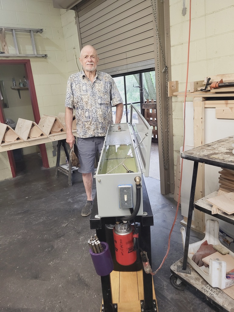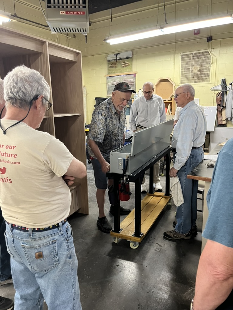 There is a project coming up for round tables with metal legs so we will find out how well it actually cleans the metal. He is pretty confident. Washing metal is the least favorite job. The next least favorite is ironing on the “wood grain” banding to make edges of plywood look like wood. One of the guys is hoping Craig will figure out a way to automate that next.