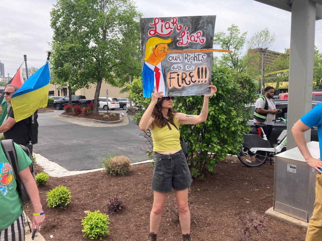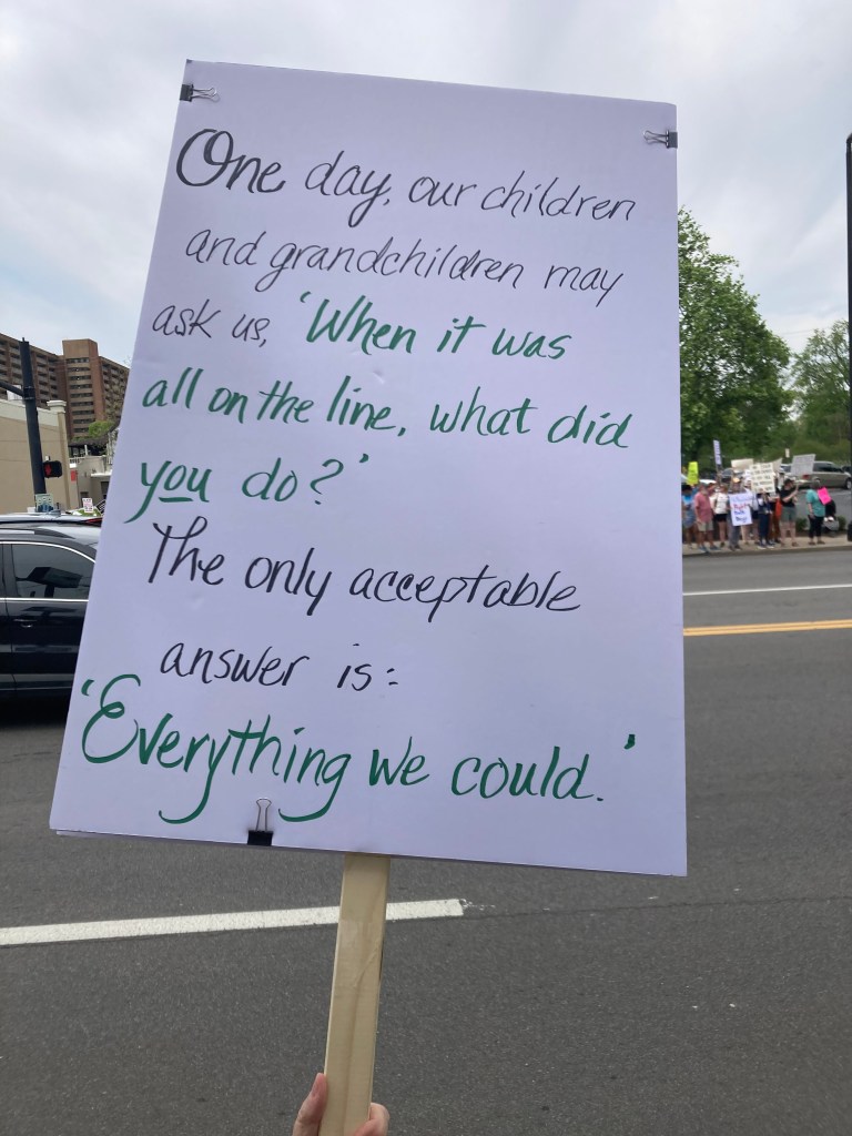 We were up early and drove the 30 minutes north to Franklin KY where we get massages. We each got an hour massage and then headed to Nashville. We drove to James and Natalie’s so Natalie could drop us off at West End Avenue. The event was scheduled for 12-2 PM and was adjacent to the Earth Day celebration in Centennial Park. Protest lasted 2 hours. There were volunteers making sure that protesters did not block the ability to walk on the sidewalk or block driveway access to any businesses. Protesters extended about 5 blocks on each side. We walked up and down the sidewalk on both sides rather than just standing. From overheard conversations it seemed that many had NOT protested on April 5th and were very encouraged and surprised by the turn-out. There were more veterans this time. Protesters certainly skew to older persons but I think there may have been more late teens and twenty somethings this time. Craig’s sign is a crowd favorite and he probably had at least a hundred people ask if they could take his photo. He created a harness to support his sign and I found my leather tool belt worked great to support mine.