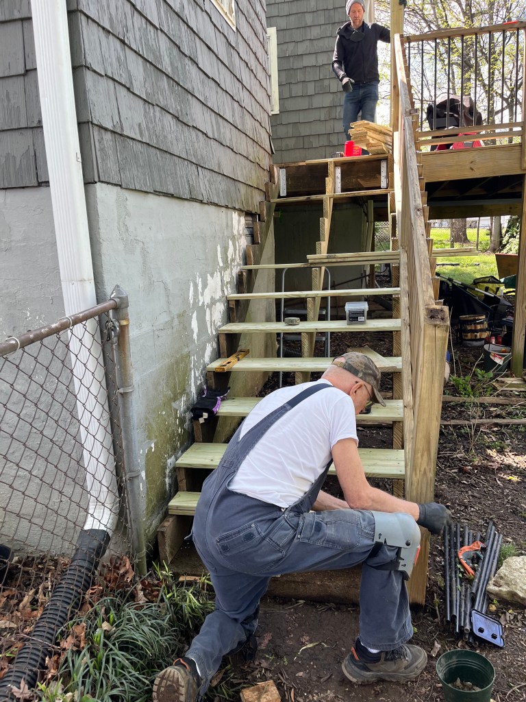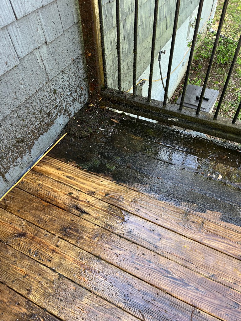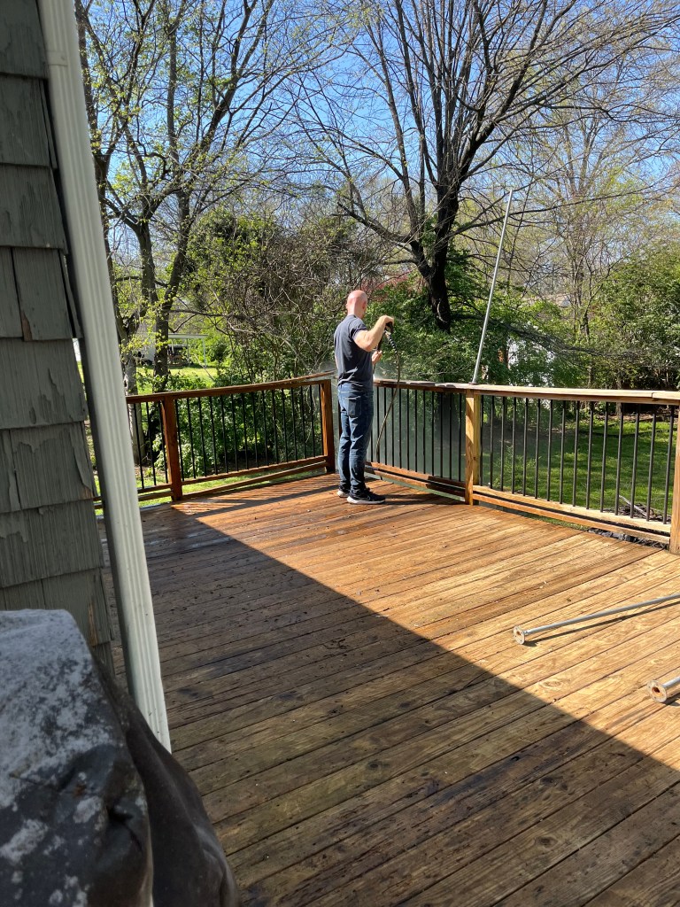 Last Wednesday we started helping James and Natalie renovate their deck. We knew it had solid support underneath but the floor, railing and stairs needed work. Initial thought was that it might just need to all be replaced but after a good power washing it was clear that much of the wood of the deck was good. Craig thought the railing could be repaired and not replaced. One of the stringers supporting the stairs needed to be replaced and we felt it best to just replace the steps rather than spend the time sanding them. After 3 days of work between rain showers the steps were replaced, all of the floor boards that needed to be replaced were done and the railing was intact.