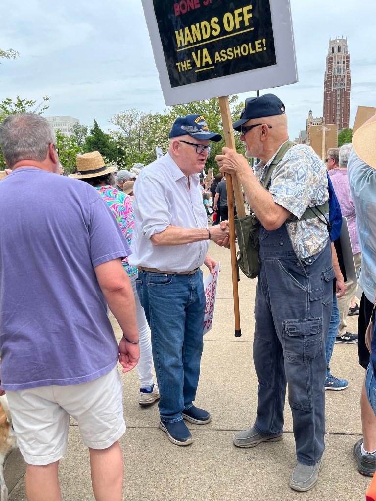 We were excited when we saw this posted on the Mobilize Us website. After attending the “round table” we are still mystified by the seeming lack of veteran presence there and at the two protests we have attended so far. I learned on a recent podcast that 60% of veterans supported Trump and 40% did not. Why are these individuals who swore an oath to defend the Constitution still on the side-lines? If one actually takes the time to read the section concerning the Veterans Administration in Trump’s “Project 2025”, there is no mystery as to what the ultimate intentions of this president are for the VA: elimination and privatization. His priorities are certainly NOT the welfare of the American veteran–nor, for that matter, do they appear to be the welfare of the majority of the American people.