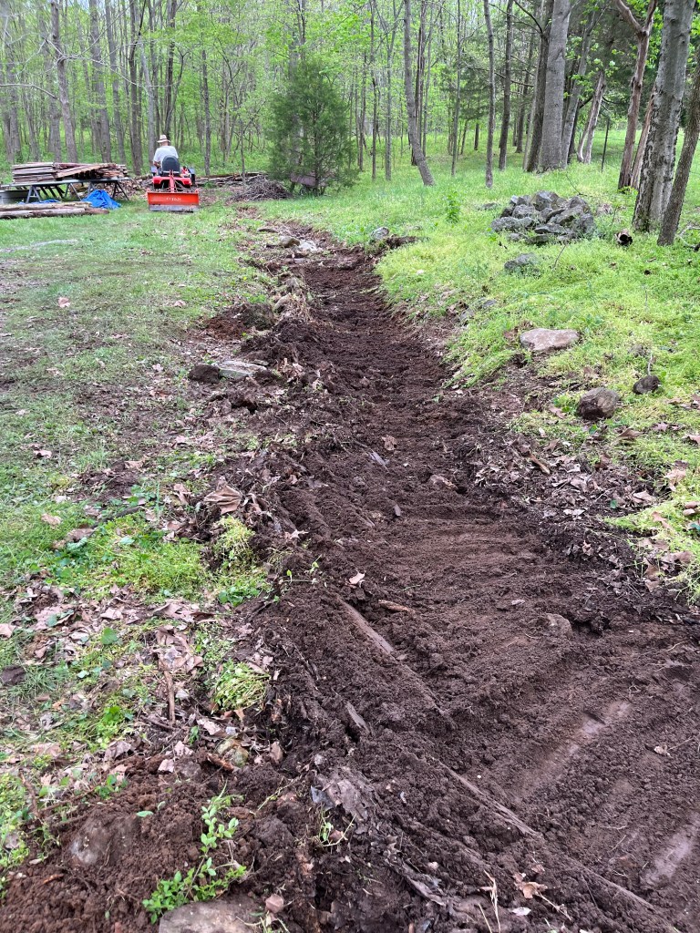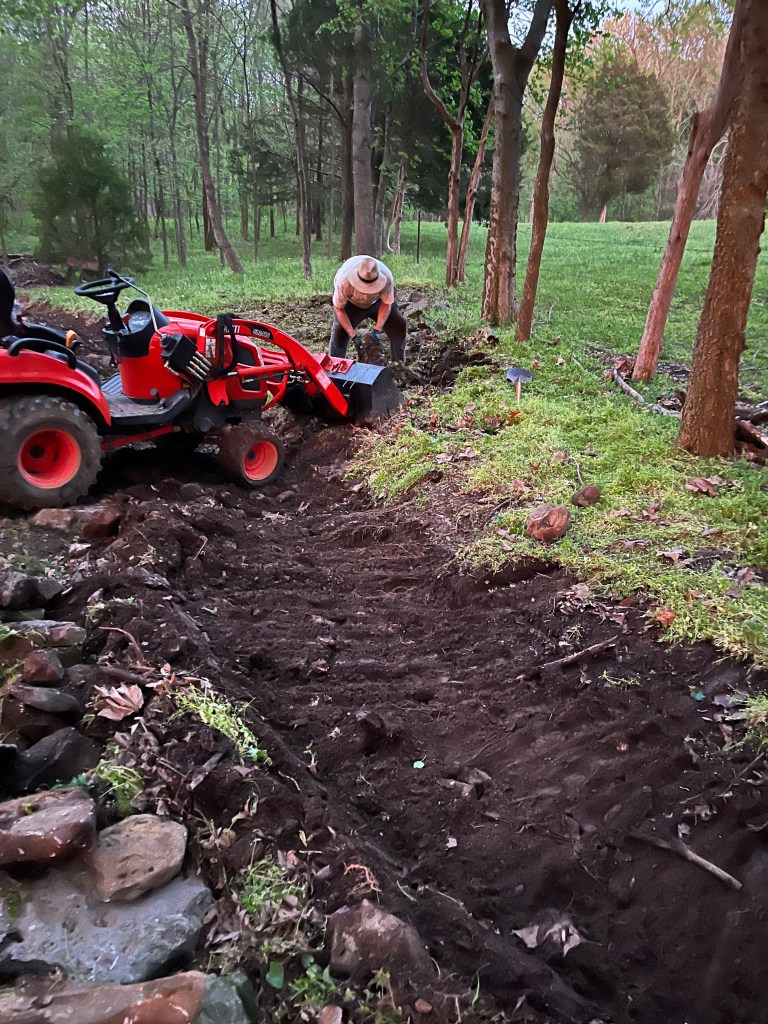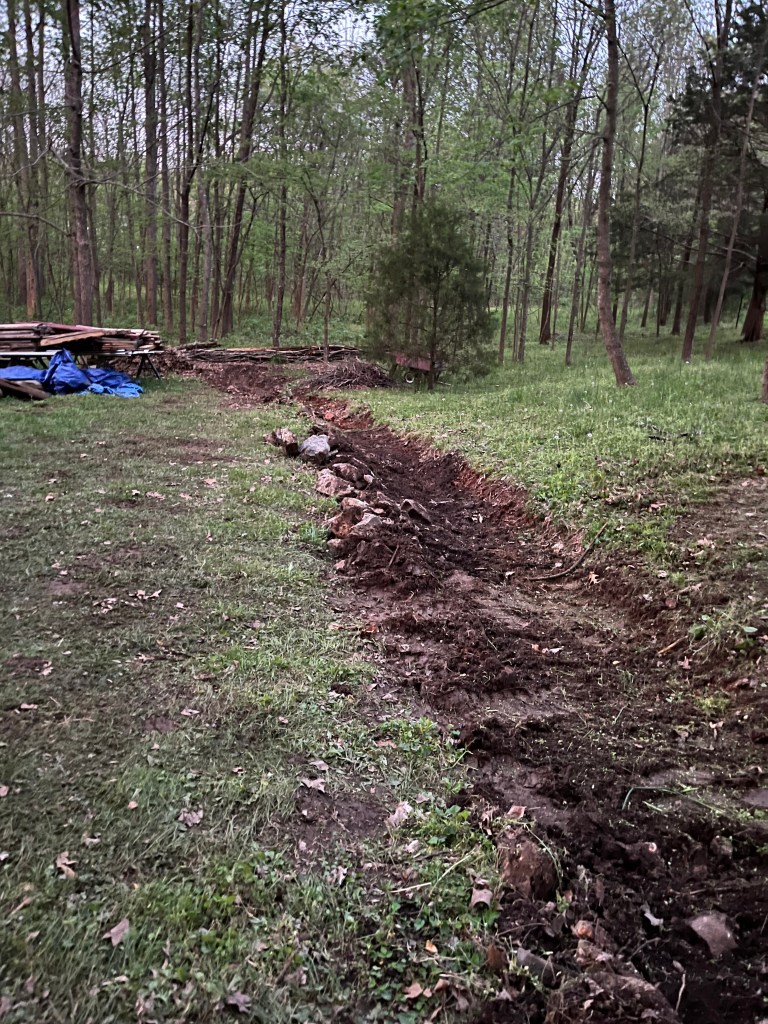 This is the dead hedge we built 2 weeks ago. It is a V-shape and extends in both directions beyond the picture. In the bottom right corner of the picture, there is a bit of red clay dirt that can be seen with a stick at the bottom edge. This is the bottom of the ravine that carries a significant amount of water from the pasture onto our property. As temporizing measures to slow the flow of water down we have filled the ravine with stones and pieces of telephone poles and sticks and stones. However the water just routes itself around the “stuff” meant to slow the flow of water and run across the property. Yesterday was our day to clean out the ravine, straighten it, shore up the downside edge with BIG stones to prevent rerouting. We want the water to stay in the ravine and dump into the wide area upslope from the dead hedge. We had a half an inch of rain early Monday morning and there was no standing water upslope from the dead hedge so that suggests we have not created a dam.