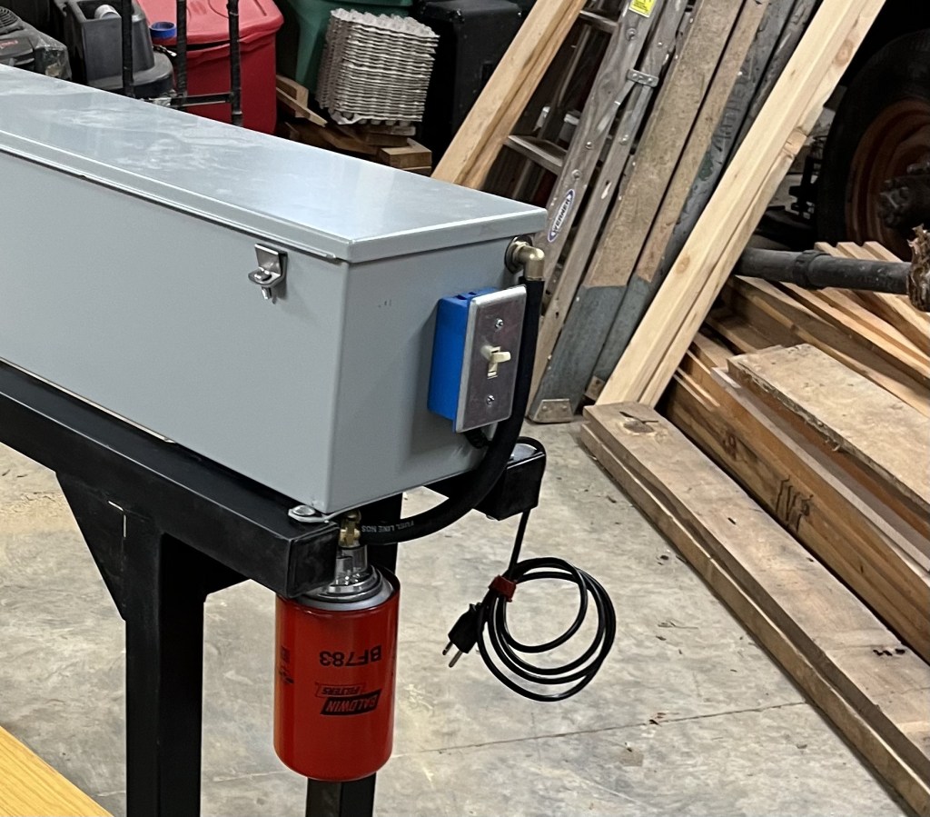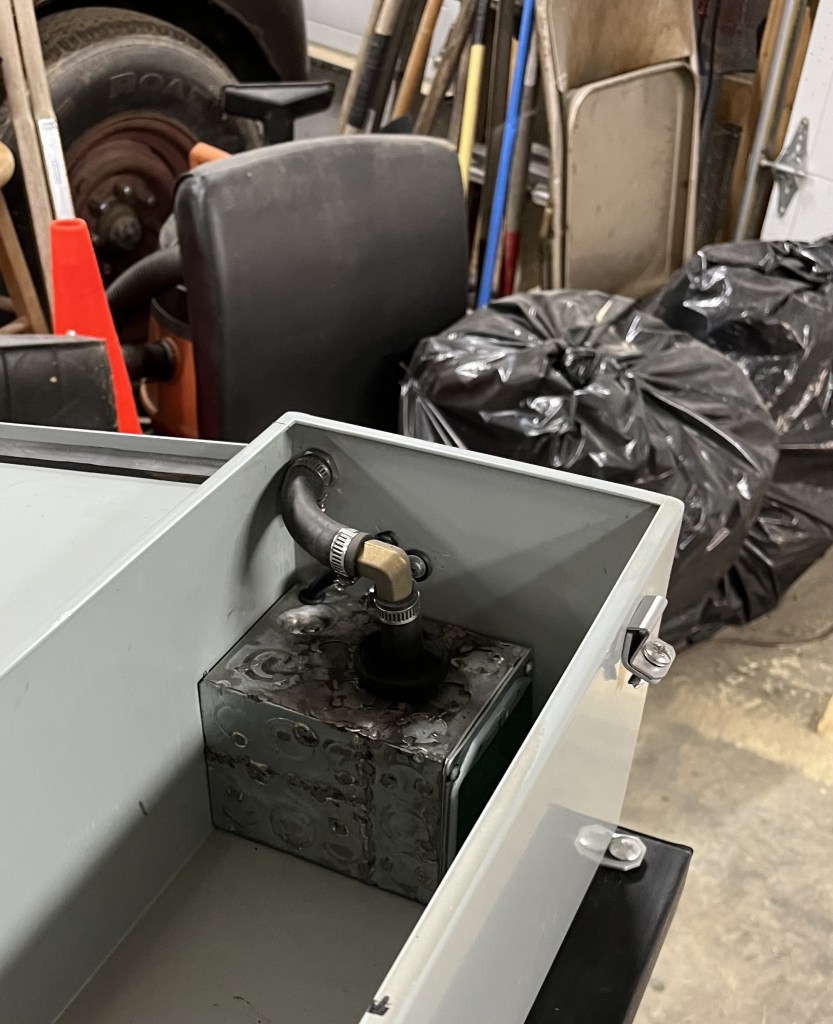 On the right side, there is the power source for the motor to pump the solvent through a red diesel fuel filter. The filter exit hose is secured along the underside of the tank to the opposite end where it is pumped back into the tank. He installed a switch to easily operate the pump.