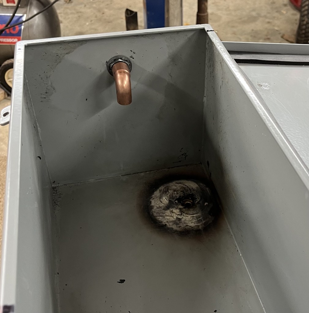 He fabricated a metal box for the pump that was placed inside the tank with a hose pumping the solvent out.