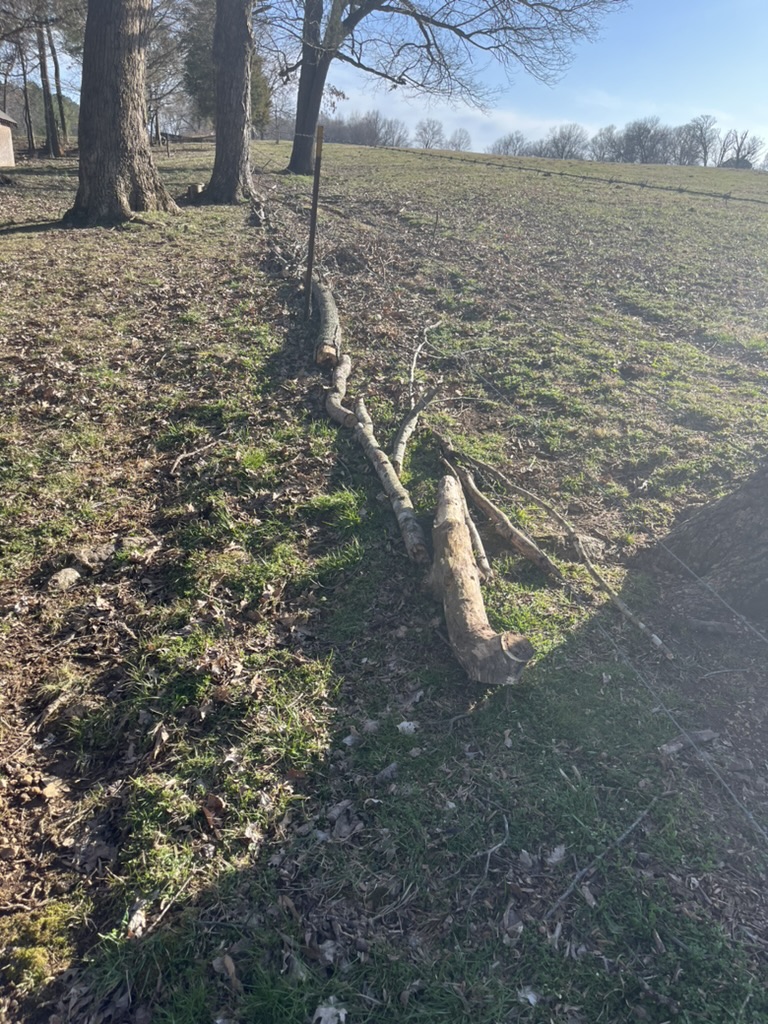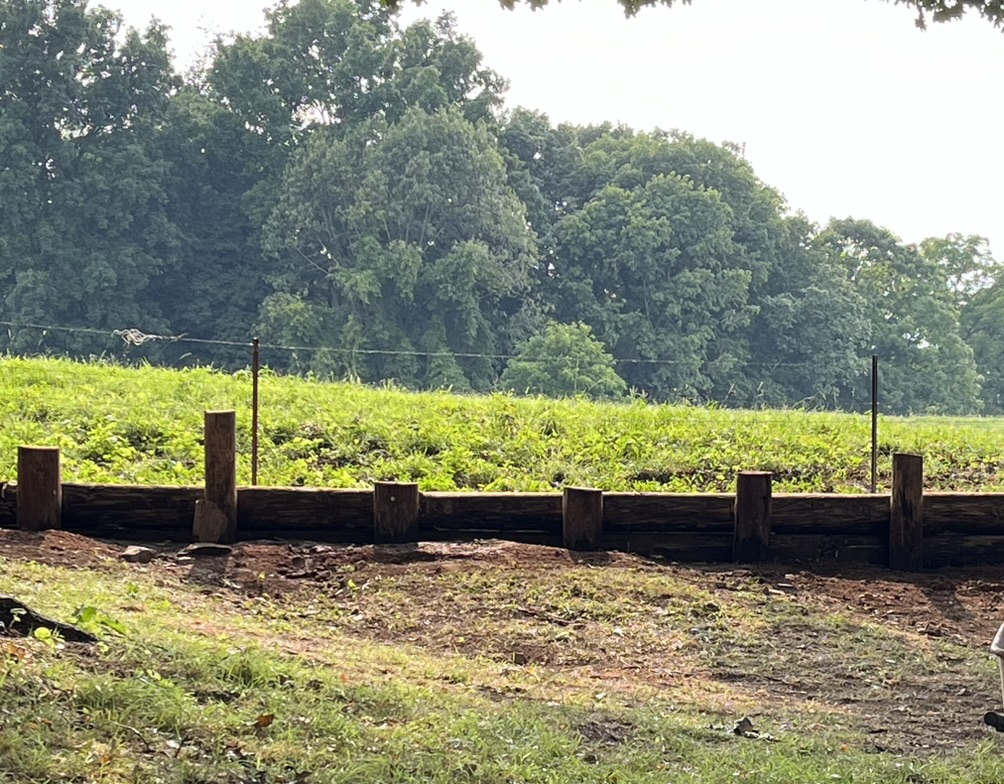 As you may recall, Craig and I built this barrier to keep water running from the adjacent pasture onto our yard and it has been quite effective for that particular spot. Later in the year we added some tree trunks along another fence line using the tractor.