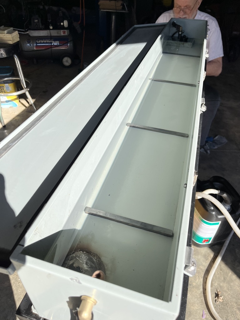 He was able to source most of the parts from the many, many things he has collected in his shop over the decades. He did need to purchase the soaking tank. He found a great metal oblong metal box with a hinged, rubber sealing lid long enough for the pieces that NTFS uses at a very reasonable price. Unfortunately what was delivered did not have a hinged, rubber sealed lid. As it turns out, the price on the tank that he purchased was an error and they sent the box that went with the price. Craig sent a very polite letter back to company and asked for the product he ordered at the price he ordered it which was on his invoice and still on their website. I was curious how they respond but they agreed to pay to ship the wrong tank back and send the tank he ordered if he paid for the shipping of the second, correct tank. This was still a great deal over what the correct list price was.